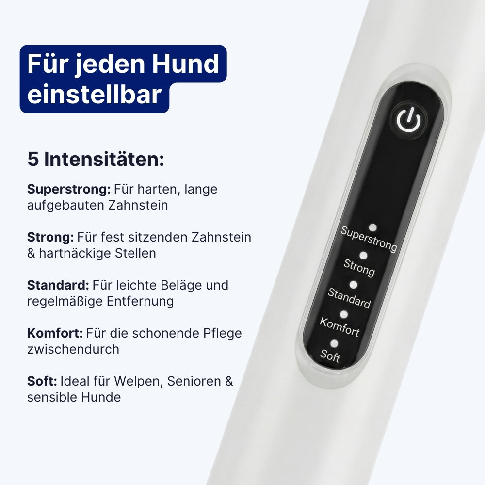 Lass deinen Hund zuerst kurz am Gerät schnuppern. Setze die Spitze anschließend sanft an den Zahn – ohne Druck.