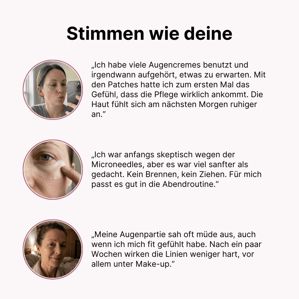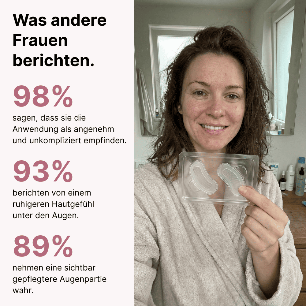 Die Haut verändert sich nicht laut, sondern schrittweise. Viele berichten von einer weicheren, ruhigeren Augenpartie und einem frischeren Eindruck – besonders beim Schminken.